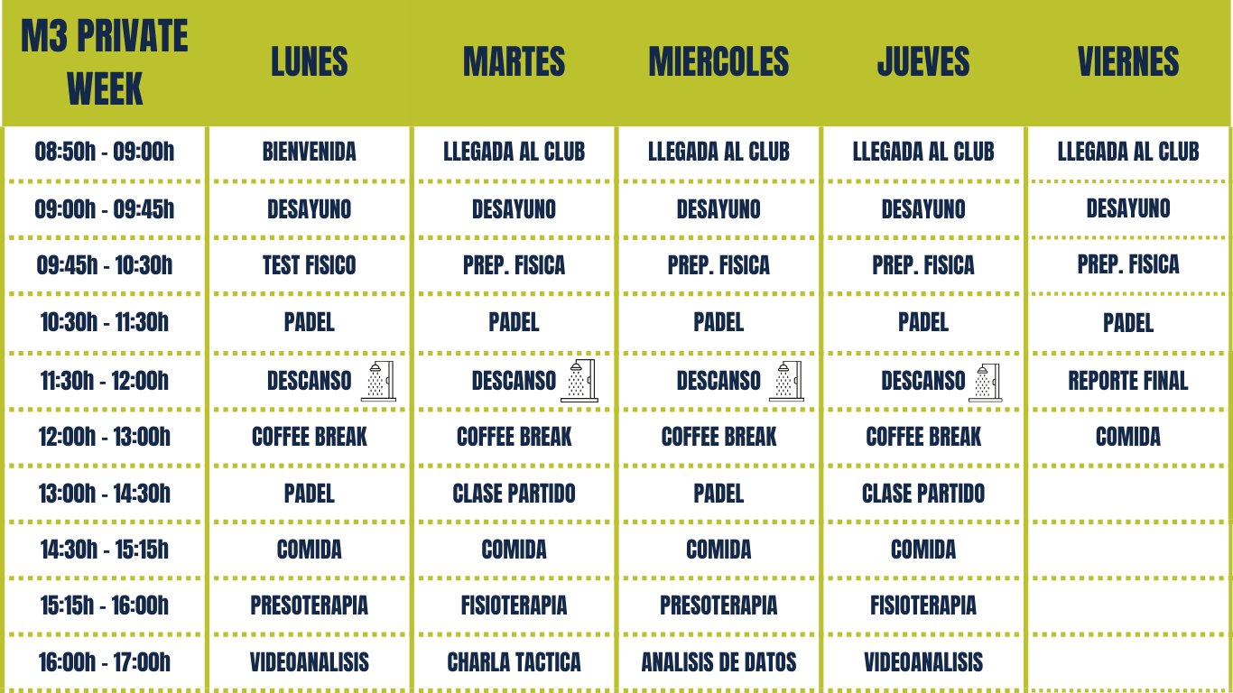 - 45 min diarios de preparación física PadelFit (puede ser compartida por otra M3 Private Week).